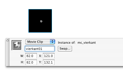 Als je nu een van de movieclips die je op je stage gesleept hebt wil afspelen of stoppen, moet je flash kunnen vertellen welke instantie je precies wil afspelen of stoppen. Daarom is het van belang dat we elke instance van een movieclip een instancename geven. Dit kan door een movieclip te selecteren en in het propertywindow, waar in het grijs instancename staat, een naam in te vullen. Deze naam mag hetzelfde zijn als de naam in de library, maar omdat je meerdere instanties op je stage kunt hebben van hetzelfde symbool is het handiger andere namen te gebruiken (bijvoorbeeld mc_vierkant (naam van het symbool) -> vierkant01(naam van de instantie)).