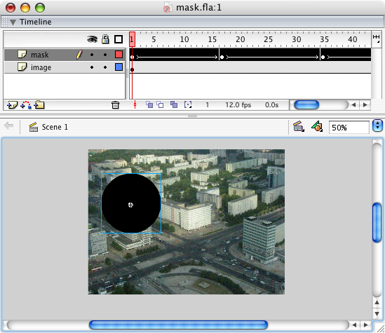 Plaats de afbeelding (JPEG) in de laag 'image'. Plaats deze cirkel in de laag 'mask' en maak een motion tween in deze laag, waarbij de cirkel van links naar rechts en van onder naar boven beweegt. Let op! De laag met de afbeelding dient evenveel frames te bevatten als de laag 'mask'. Controleer of de animatie goed werkt.