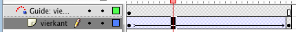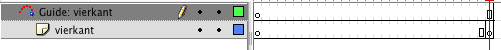 Click met je rechter muisknop op de laag die je zojuist hebt gemaakt. Er verschijnt een contextueel menu, selecteer uit dit menu de optie 'Add motion guide'. Er verschijnt nu een niewe laag boven je oorspronkelijke laag, met de naam 'Guide: vierkant'. Je kunt deze laag eventueel nog een andere naam geven.