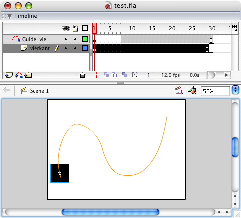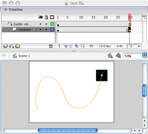Selecteer vervolgens het laatste keyframe van de laag 'vierkant' en plaats hierin ook het symbool 'vierkant'. Klik het symbool ook vast aan de de motion guide, maar dan op een andere plaats.